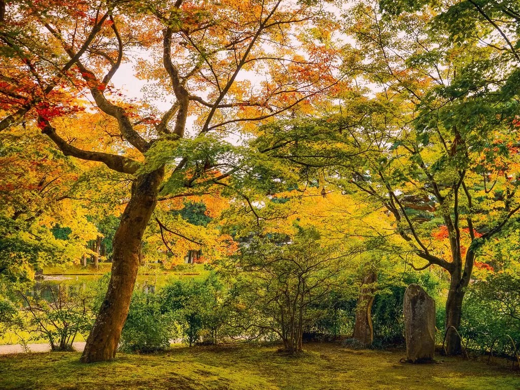 當時到達毛越寺已經是傍晚時分,把握時間環繞大泉池一圈,欣賞這片沈靜在晚霞中的淨土庭園。在園內的看板介紹已經知道淨土庭園大致上就保留大約800年前左右的風貌,也就走得特別慢,特別去感受一下百年來灑落在這片池子的斜陽,沐浴在時光交錯的縫隙之中。