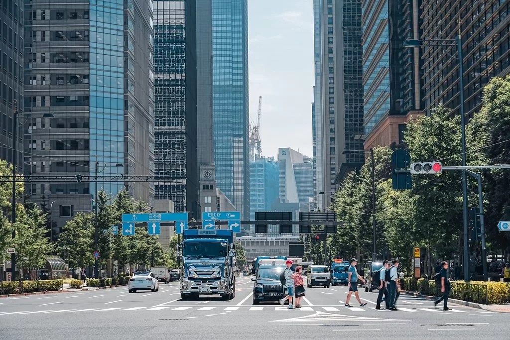 搭乘JR抵達東京車站,已經是日暮時分。街道兩旁時尚的高樓大廈,繁忙的街道路口。